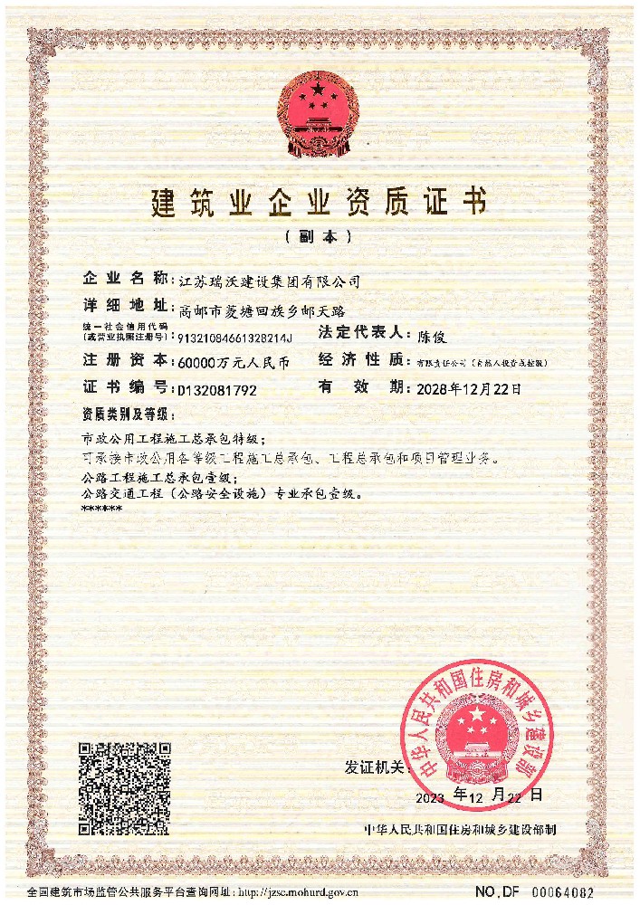 江蘇瑞沃建設集團有限公司成立于2007年,是一家以市政、交通工程建設為主導,集房屋建筑、交通安全設施、城市道路照明工程、電力工程、隧道工程、航道工程及投融資為一體的綜合性企業。企業注冊資本60000萬元,現有各類技術人員580人,其中中、高級以上人員498人,注冊類人員268人,一、二級建造師166人。公司榮獲“江蘇省建筑業優(yōu)秀企業”、“江蘇省五一勞動獎狀”,連續(xù)多年被評為“揚州市先進企業”、“江蘇省建筑業百強企業”,連續(xù)八年蟬聯百強企業基礎設施類第一名。